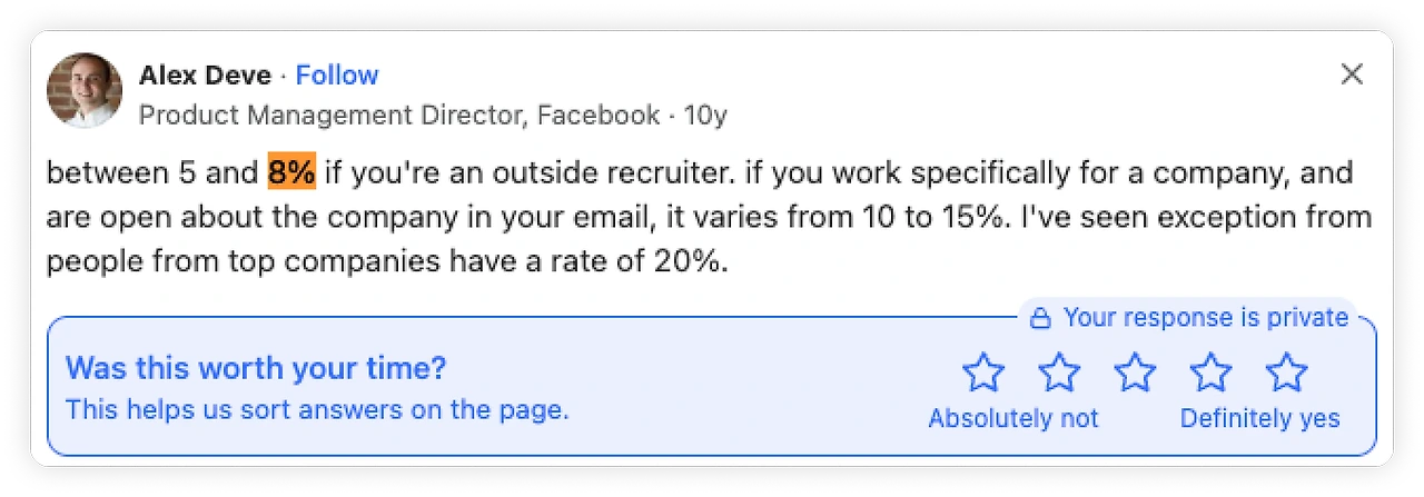 우선 미국사례를 한 번 볼까요? Meta의 PM 디렉터인 Alex Dave는 미국 테크기업의 커피챗 매칭률은 평균 10-15%를 보인다고 합니다. 채용 브랜딩이 잘돼있는 빅테크인 경우 20% 수준을 보인다고 합니다. 이 수치는 응답률이 더 낮은 개발자를 감안하지 않은 수치이며 해당 수치를 감안하면 8% 수준에 수렴된다고 보면 될 것 같습니다. 회사의 상황마다, 리크루터의 메세지 내용에 따라 이 수치는 달라질 수 있지만 쉽게 말해서 100명의 후보자들에게 메세지를 보내면 10명이 채 안되는 후보자와 커피챗을 할 기회가 확보된다는 것이죠.