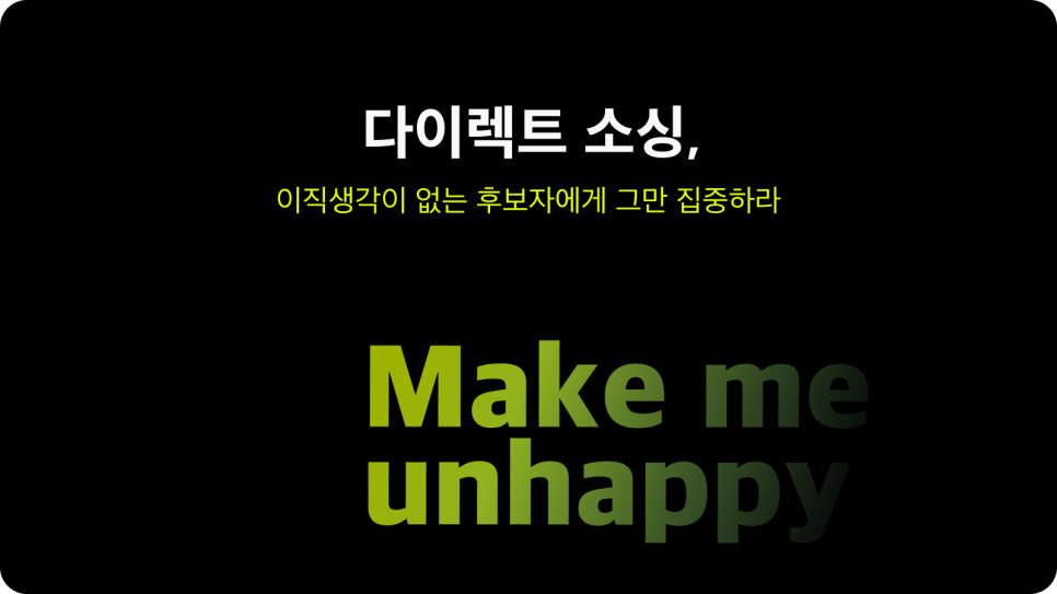 배경은 이렇습니다. 1963년 UCLA에서 교수로 재직 중인 뎀세츠는 경쟁 대학교로부터 UCLA 생활에 만족하고 행복한지 질문을 받습니다. 단번에 요즘 표현으로 다이렉트 소싱을 위한 질문이라는 것을 알아챈 뎀세츠는 이렇게 말하죠. “Make me unhappy”. 그리고 결국 뎀세츠는 시카고 대학교로 이직을 합니다. 이 사례는 다이렉트 소싱의 본질을 잘 보여줍니다. 만족하며 회사를 다니는 후보자들에게 우리회사의 미래와 강점을 설명하여 현재의 상황보다 더 매력을 느끼게 하는 것 그리고 탑티어 인재들을 확보하는 것. 다이렉트 소싱의 본질입니다.