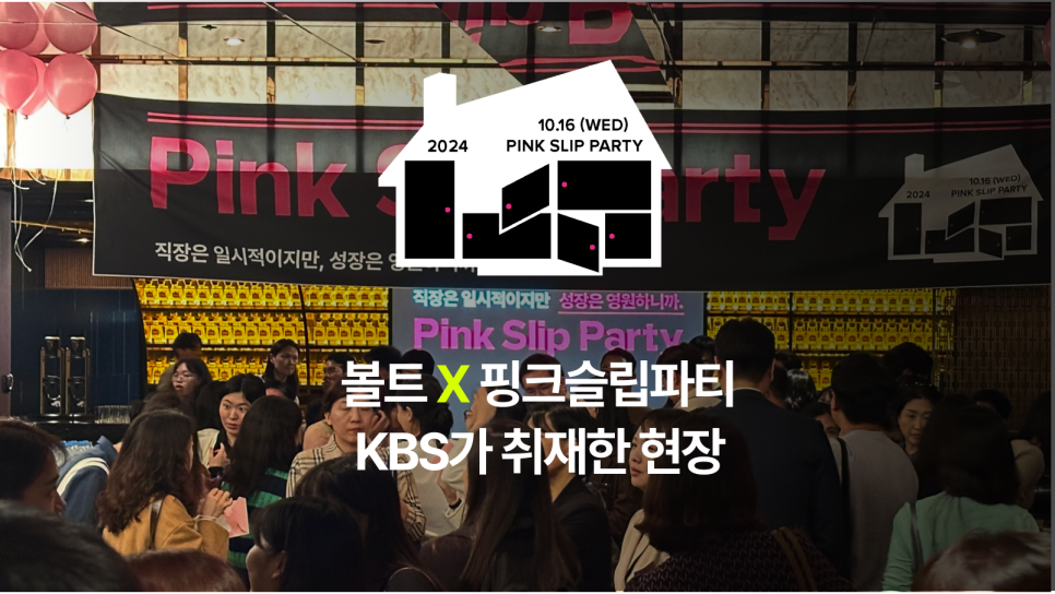 비자발적 이직은 1년 전에 비해 4.7% 증가했습니다. 이러한 상황에서 볼트엑스는 구직자들이 희망차게 재도전할 수 있는 기회들이 만들어지길 바랐습니다. 그렇기에 실직의 우울함을 한탄하기보다, 실직의 아픔을 당당하게 드러내며 재출발을 탐색하는 발랄하고 자유로운 '파티', 핑크슬립파티를 기획했습니다.