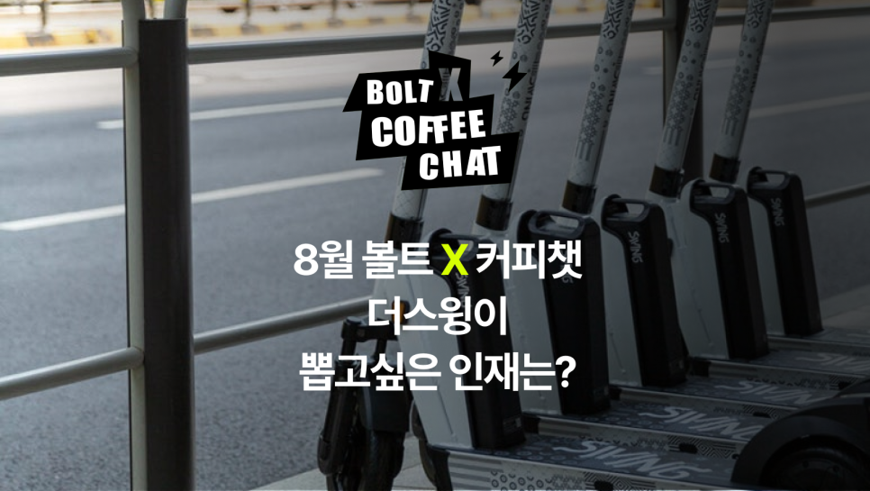 요즘은 길을 가다 전동 킥보드를 자주 마주치게 되죠. 혹시 그 킥보드, 어느 회사에서 만드는 건지 알고 계신가요? 바로 8월 볼트X 월간커피챗 두 번째 세션을 맡았던 모빌리티 회사, <더 스윙>에서 만드는 거랍니다! 이번 글에서는 전동 킥보드를 넘어 모빌리티 시장을 정복하고 있는 기업, <더 스윙> 기업 소개 세션의 현장을 전달해드릴게요.