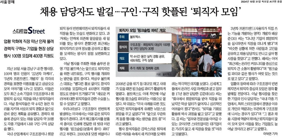 3년차 프론트엔드(사용자가 직접 쓰는 기능을 개발하는 영역) 개발자 배상준(30) 씨는 “다니던 기업이 희망퇴직을 실시하면서 직장을 떠나게 됐다”며 “비슷한 상황에 처한 사람들과 고민을 공유하고 채용 담당자도 만나고 싶어 행사장을 찾았다”고 전했다. 배씨는 이어 “최근에는 온라인 커뮤니티를 중심으로 퇴직자 간 소통이 활발하다”며 “핑크슬립 파티와 같은 행사가 여럿 있는 것으로 알고 있다”고 말했다.
