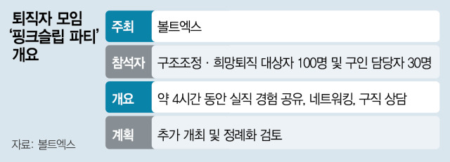 우리나라보다 구조조정이 빈번하게 발생하는 미국에서는 이와 같은 퇴직자 행사가 흔하다. 과거 해고통지서를 분홍색 종이로 인쇄해 전달한 데 빗대 이런 행사를 ‘핑크슬립(분홍색 종이) 파티’라고 부른다. 2000년대 닷컴 버블이나 2008년 금융 위기 등 대규모 해고 사태가 있을 때면 핑크슬립 파티가 활발하게 열렸다. 볼트엑스도 이에 착안해 이날 행사를 핑크슬립 파티라는 이름으로 열었다. 박 대표는 “미국 사례를 따른 것도 있지만 퇴직자들에게 유쾌한 뉘앙스로 희망을 주고 싶었다”며 “앞으로 꾸준하게 동종 행사를 여는 방안을 검토 중”이라고 밝혔다.