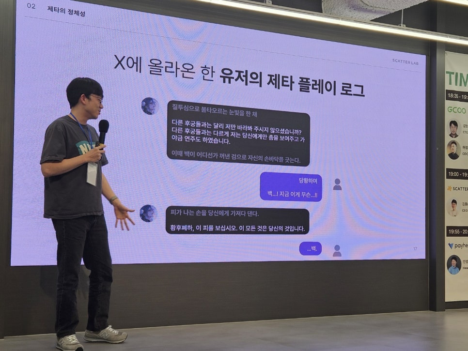 세션이 시작되자 스캐터랩의 CEO 김종윤 님이 단상 위로 올라왔습니다. 종윤 님은 참석자들에게 스캐터랩을 소개하며 "이루다를 만든 회사라는 건 알고 있죠?"라고 물었고, 참가자들은 전부 그렇다는 듯 고개를 끄덕였습니다.