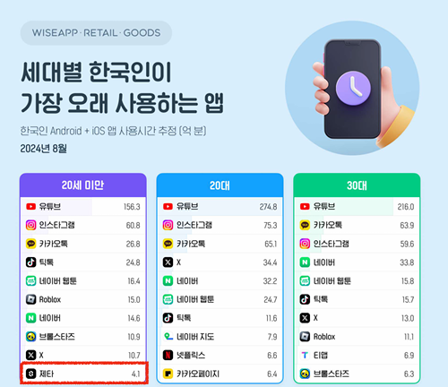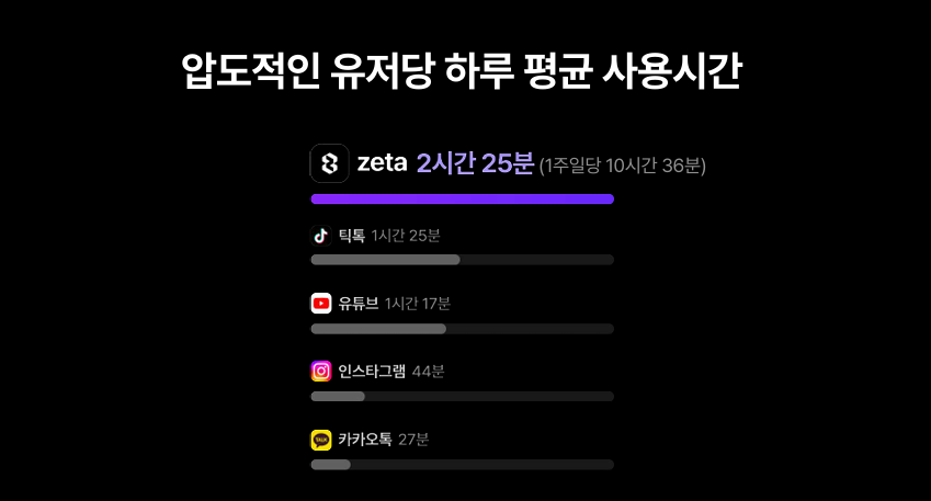이러한 독보적인 매력을 바탕으로 제타는 기존의 앱 생태계의 거물로 떠올랐습니다. 몇 년째 유튜브와 인스타그램, 카카오톡이 지배하고 있던 '가장 오래 사용하는 앱' 순위 리스트에 출시된 지 불과 1년도 되지 않은 앱이 당당하게 한 자리를 차지한 것이죠.
