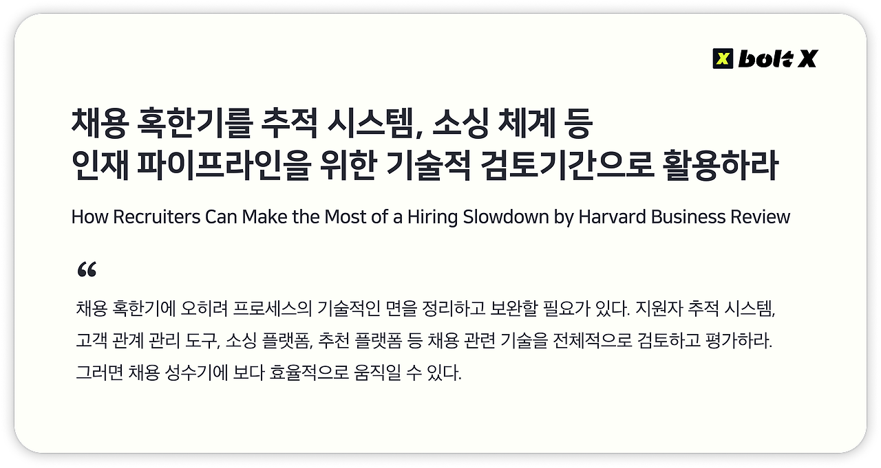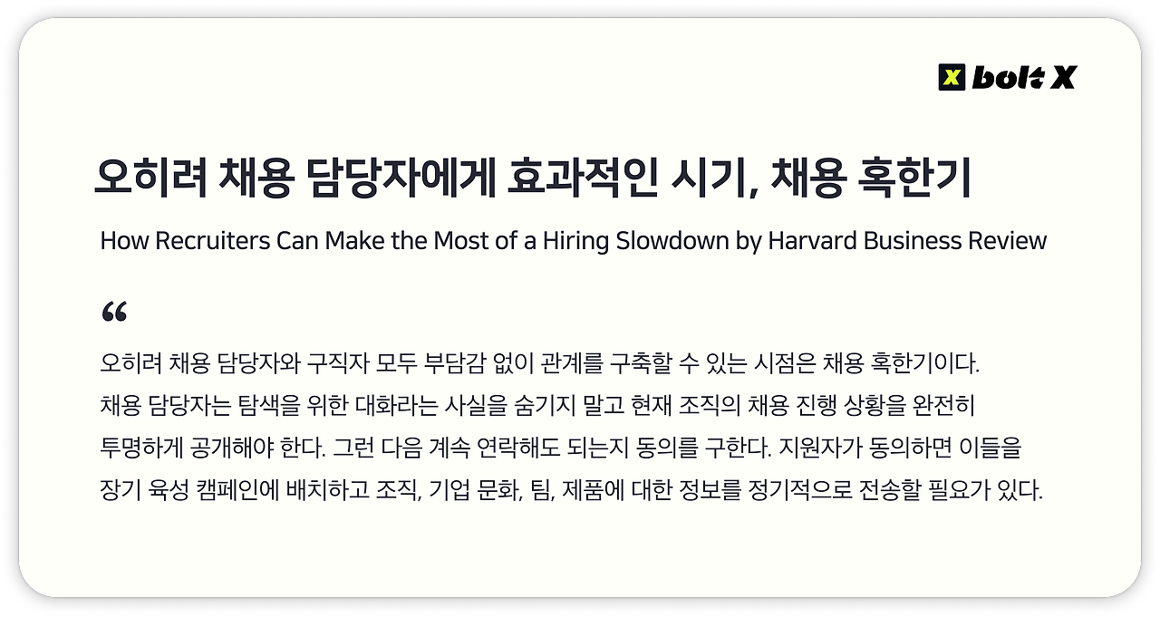 실제로 지난해 HBR(하버드 비즈니스 리뷰)에 게시된 아티클 How Recruiters Can Make the Most of a Hiring Slowdown 에서도 똑같은 이야기를 합니다.