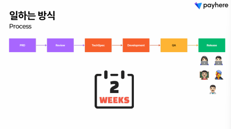 업무 프로세스는 PRD 작성, 리뷰, 테크스펙 작성, 개발, QA, 배포의 순서로 2주 단위로 진행됩니다. 얼핏 보기에는 다른 테크 조직의 업무 순서와 크게 다를 것이 없어보이긴 하지만, '테크스펙'이라는 단계가 들어가 있다는 점이 유의할 만합니다. 이전에 뱅크샐러드에서 테크스펙이라는 문서를 작성한다는 점을 소개드린 바 있었는데요. 페이히어에서도 페이히어만의 테크스펙을 작성하여 개발의 완성도를 끌어올리고 있습니다. 페이히어의 테크스펙에는 개발하는 대상의 배경, 목표, 목표가 아닌 것들, 마일스톤 등 개발 과정에서 마주하는 판단의 순간에서 결정의 근거가 되는 내용들이 들어가 있습니다.