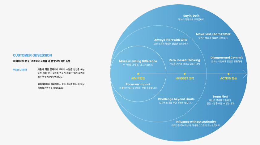 페이히어에는 일하면서 판단의 기준이 되는 열 가지 가치가 있고, 열 개의 핵심 가치는 '고객 집착(Customer Obsession)'라는 한 가지 핵심 목표로 이어집니다. '집착(obsession)'이라고 표현할 만큼 페이히어는 고객의 만족에 집착합니다. 성현 님께서는 페이히어의 가치를 잘 보여주는 일화 한 가지를 소개해주셨습니다. 언젠가 강원도에 있는 페이히어 매장에서 오류가 발생했는데, 성현 님을 포함한 리드급 실무진들이 직접 차를 몰고 해당 매장을 방문해 사과의 뜻을 전달하고 재발 방지를 약속했다고 합니다.