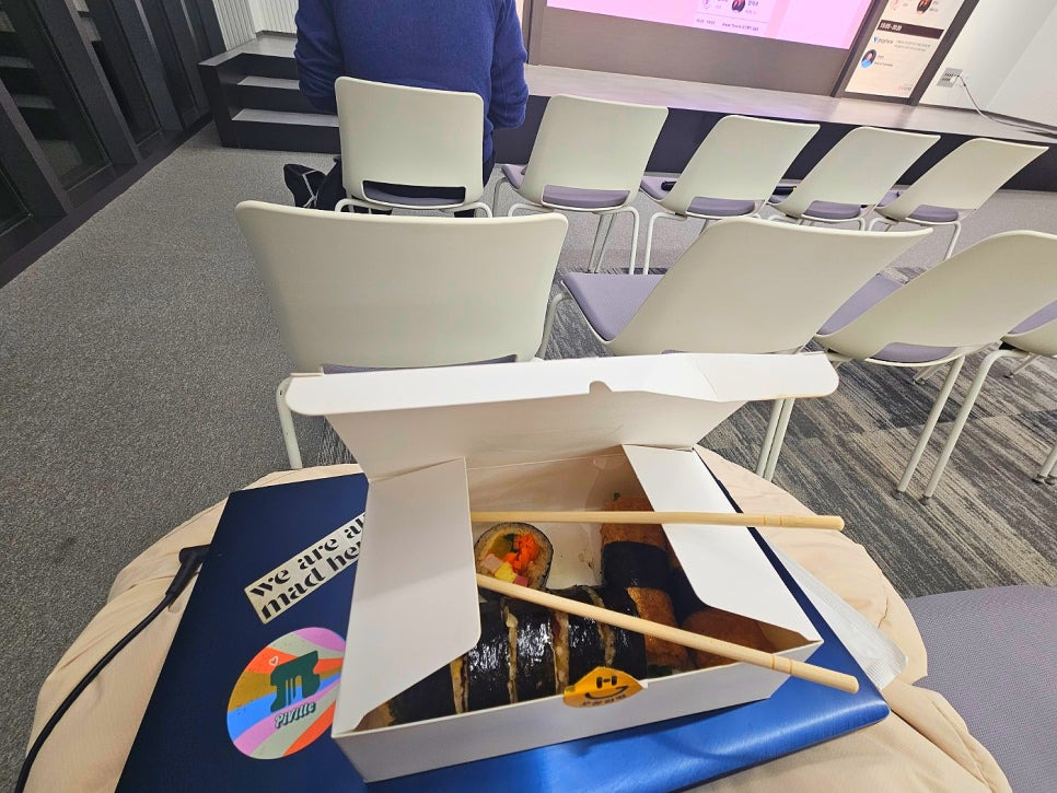 저녁 시간대에 진행이 되는 월간커피챗에는 항상 간단한 저녁 식사가 제공되는데요, 이번에는 볼트엑스 팀이 직접 먹어보고 반한 김밥으로 저녁을 준비했습니다. 제공되는 도시락은 저녁도 못 먹고 행사에 참석해주시는 분들을 향한 볼트엑스 팀의 감사함의 표현이랍니다.