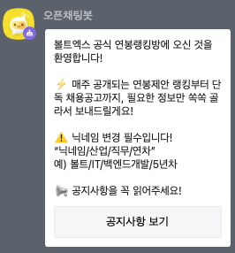 연봉랭킹방은 볼트엑스 (연봉어택) 참가자분들을 위해 특별히 마련한 카카오톡 오픈채팅방입니다.