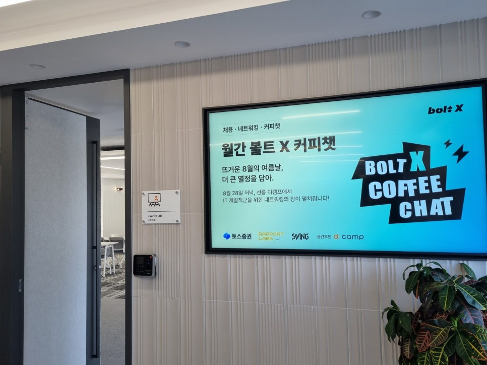 지난 28일 선릉 디캠프에서 볼트엑스가 진행하는 채용 네트워킹 행사, 볼트X 월간커피챗이 진행되었습니다. 8월 볼트X 월간커피챗의 기업 세션에서는 회사의 비전과 미션, 조직 구성, 채용하고 싶은 인재상 등 기업의 전반적인 정보를 얻을 수 있었어요.