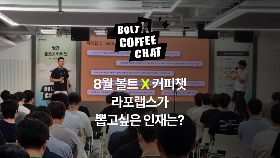 8월 볼트X 월간커피챗에는 라포랩스의 백엔드 챕터 리드 최새암님이 참석해 회사의 비전과 성장 상황, 개발 조직의 구성과 개발 문화를 설명하고, 현재 직면하고 있는 문제와 그에 따라 채용하고 싶은 인재까지 솔직하게 말씀해주셨어요!