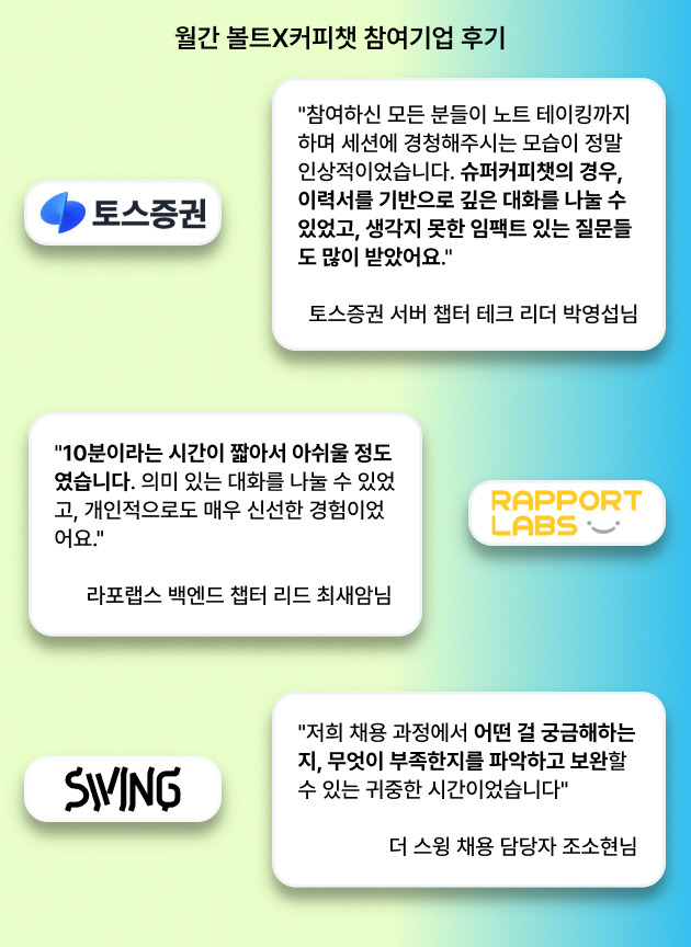 행사에 참여하면, 열정적이고 역량 있는 인재들에게 기업을 소개할 뿐만 아니라, 사전에 참여자들의 이력서를 검토하고, 관심 있는 인재들과 개별 커피챗 시간을 통해 직접 소통할 수 있습니다. 볼트X 월간커피챗 행사는 인재 확보를 위한 최적의 기회가 됩니다!