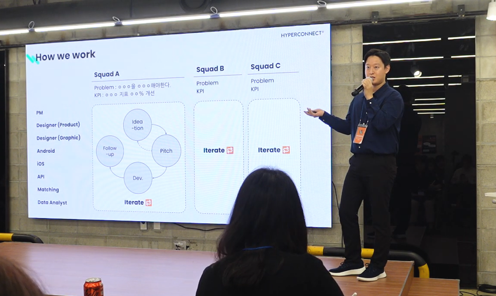 기록적인 성과를 내고 있는 하이퍼커넥트는 어떻게 일할까요? 많은 거대 기업들이 규모가 커지며 대기업의 반열에 든 뒤에는 예전의 속도감 있는 문화를 유지하지 못하는 경우가 더러 있습니다. 하지만 하이퍼커넥트는 다릅니다. 하이퍼커넥트 내에는 스쿼드라는 목적 조직(여러 종류의 직무가 한 팀으로 구성되어 같은 목적을 달성하는 형태의 조직)이 여러 개 존재하고, 각 스쿼드가 조직에게 할당된 비즈니스 목표(문제와 KPI)를 달성하기 위해 빠르게 아이데이션하고, 시도하고, 학습하는 과정을 반복하며 프로덕트를 성장시켜나갑니다.